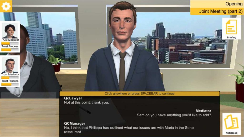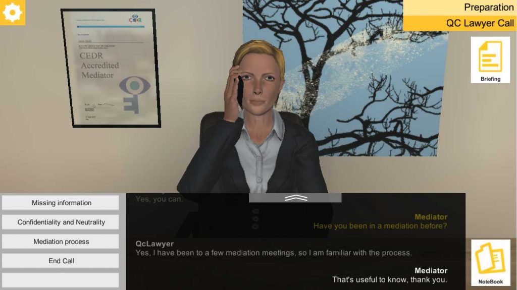 Created by HighSkillz in conjunction with CEDR – the largest conflict management and resolution consultancy in the world, both simulations offer convenient online mediation training. They engage users in a way that conventional training sometimes lacks, placing them in realistic situations where they have to apply judgement and tact.
